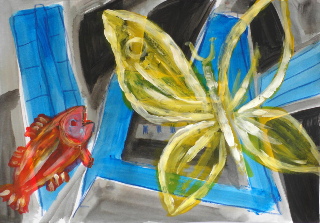 Vorerst gibt es Fische und Schmetterlinge in Acryl auf Leinwand zu betrachten.